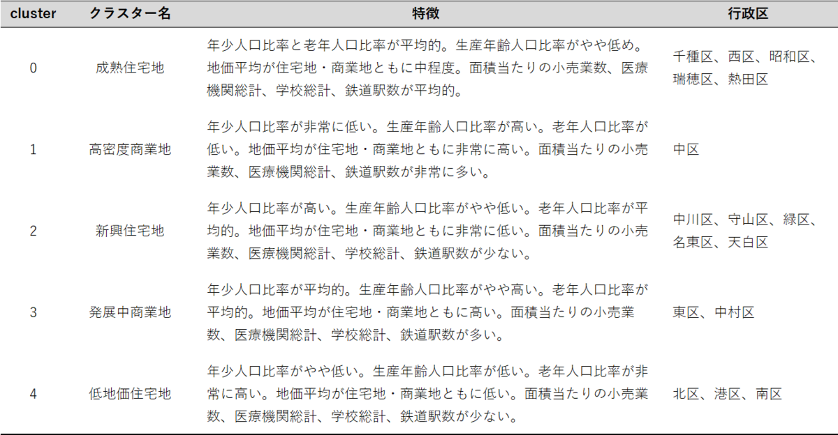 これらの結果から、第1主成分は都市化の度合いやインフラの充実度を反映していると考えられます。生産年齢人口が多く、地価が高く、商業施設や医療機関、鉄道駅が多い地域が高い値を取ります。また第2主成分は人口構成の違いを反映しており、老年人口が多く、年少人口や生産年齢人口が少ない地域が高い値を取ります。 これらの特徴から、各クラスターに名前をつけると下記のようになります。