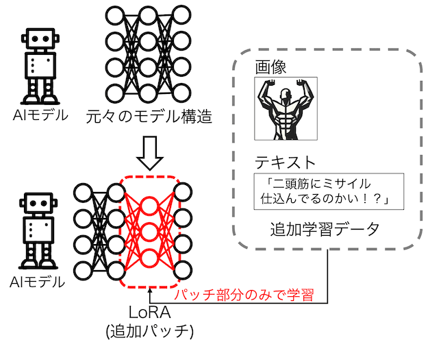 言語モデルは非常にサイズが大きいために、再トレーニングをするにも、かなりの時間とコストを要します。そのような問題に応えるべく、「元々のモデルのパラメータはそのまま保持し、追加のパッチを当てて、その部分のみトレーニングする」ことで、時間とコストの効率化を図るというのが、LoRAの特徴です。