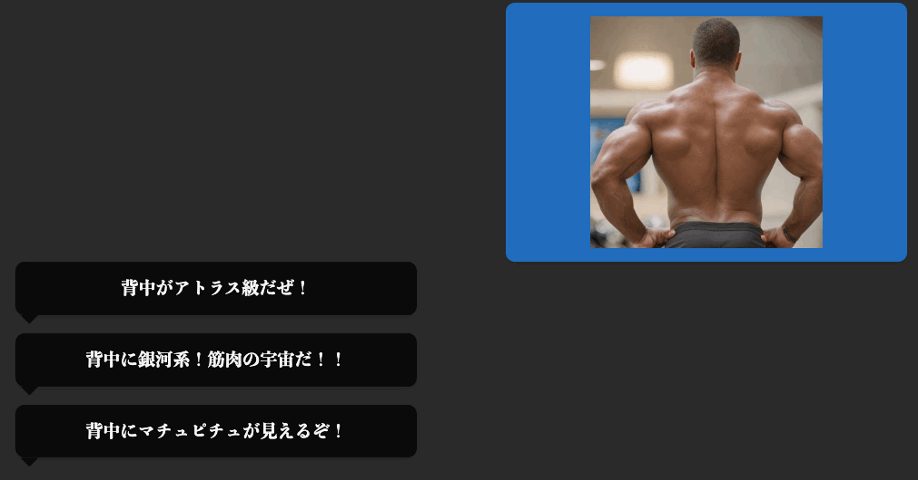 また、テキストと画像の組み合わせも非常に重要です。例えば、背中の画像をアップロードしたのに「その腹筋、まるで手榴弾!」「腹直筋、爆発!!」と言ってはいけません。背中の場合には、「海より広い広背筋!」「魔の三角海域!」と褒め称えるのが筋肉に仕える者としての模範的な対応です。つまり、先ほど挙げたポーズそれぞれに紐づいた魅せたい部位に対応したテキストを組み合わせてあげる必要があります。