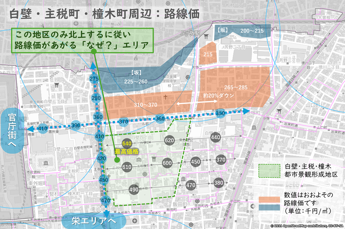 保存地区の核の周辺にあたるこのあたりも、興味深いエリアです。北側では、台地のへりにあたる坂に沿って路線価が下がるという、地形のセオリー通りの動きが見られます。