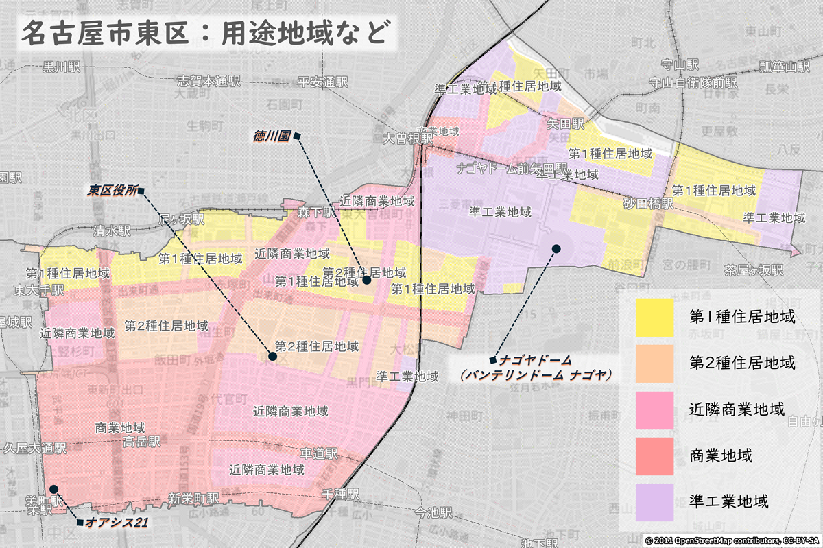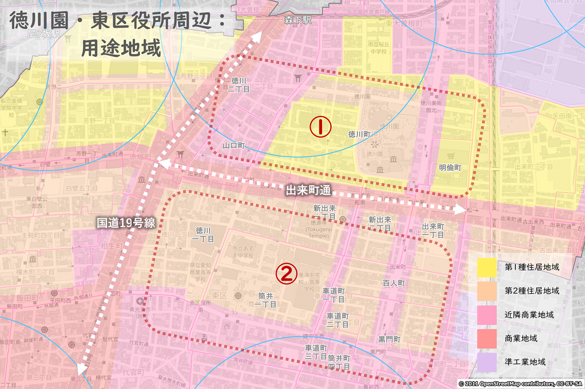 東区役所、東警察署、東消防署といった行政施設と、尾張徳川家の菩提寺である建中寺があるこのエリアは、大通りから一歩入ると第二種住居地域が中心となり、建物の高さも落ち着きます。大半が駅から半径500m圏外です。