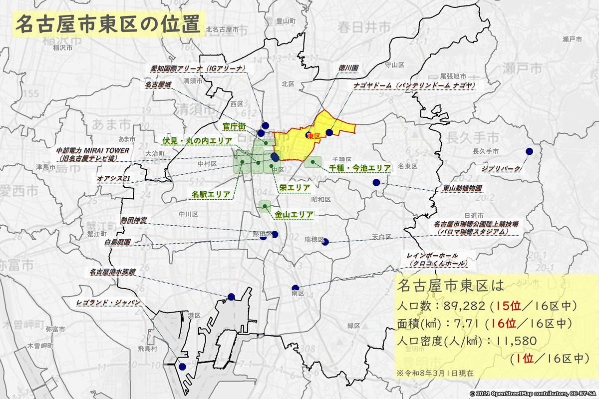 【名古屋市東区の位置とビジネス街、繁華街、ランドマークの位置を確認】