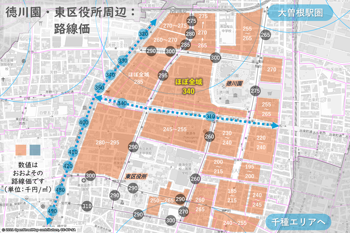 路線価を見ると、大通りから離れるにしたがって価格が下がり、南東の車道駅・千種駅に近づくにつれて再び上がっていくという、駅距離のセオリーに比較的忠実な動きをしています。