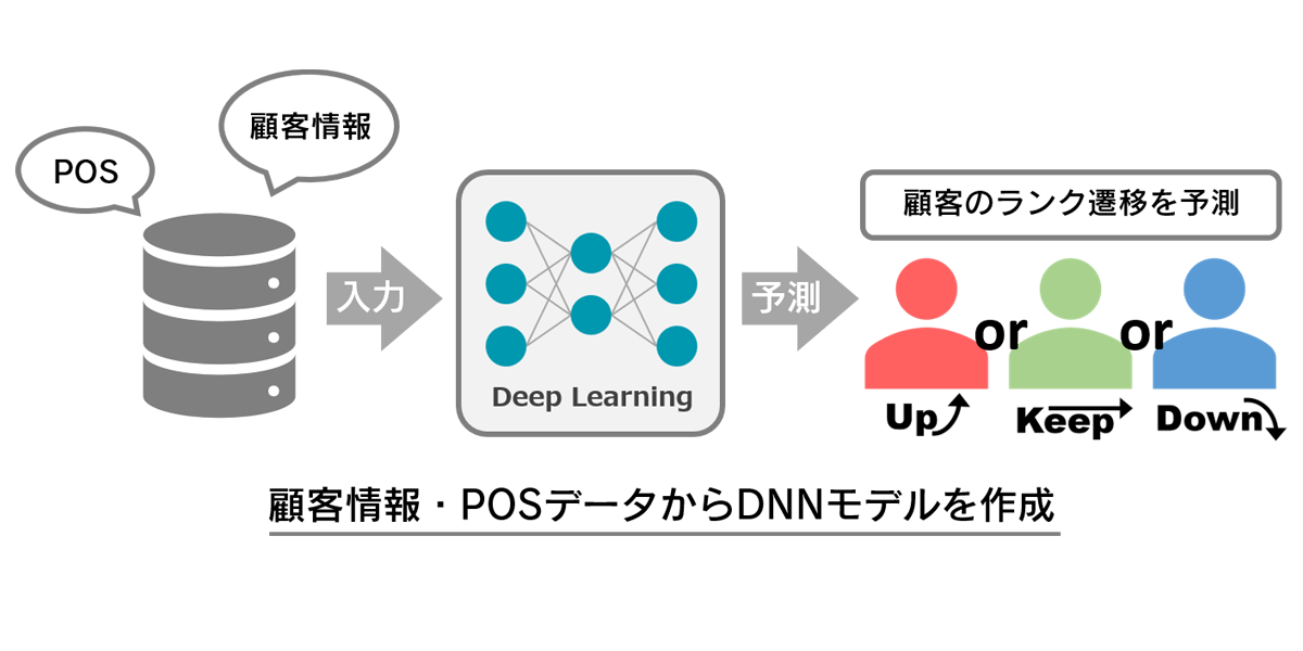 過去のPOSデータを学習させることでDNN(ディープニューラルネットワーク)モデルを作成。POSデータをモデルに読み込ませることで未来の顧客ランクがどのように遷移するのかを予測することでき、ランクが上下する顧客それぞれに対して適した対策を練ることができる。また顧客ランクを予測した結果からPOSデータのどのような要因からランクが遷移するのか分析を行った。